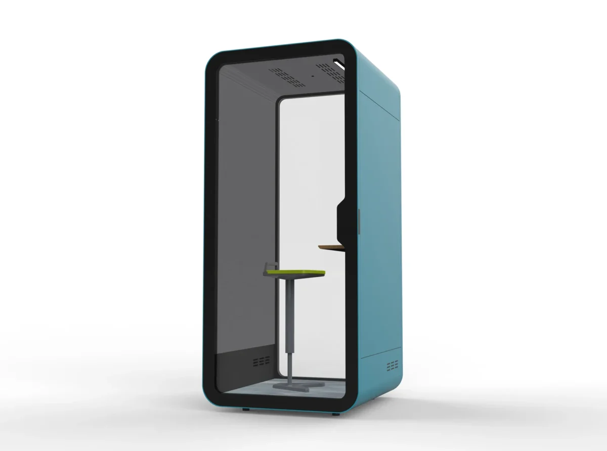 Soundproof to 31 decibels Wheelable castors Height-adjustable desk ECO-conscious materials Ambient lighting Fresh continuous flow of air Can be branded (vinyl wrapped) Motion sensors Space saving Self-closing door